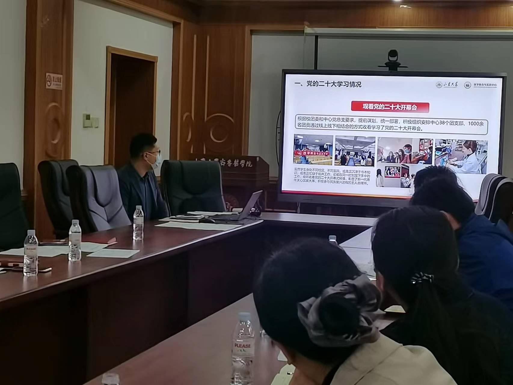团总支书记徐雨辰代表与会人员交流了学习党的二十大精神的体会。他以“学好党的二十大精神,做好新时代共青团建设”为主题,介绍了各级团组织和广大团员通过线上线下相结合的方式学习宣传贯彻党的二十大精神的工作情况,并就党的二十大精神宣讲团临时团支部的规划和建设情况进行了汇报。他表示,由医融中心青年师生代表组成的党的二十大精神宣讲团,将通过集中学习、交流宣讲等形式深入师生群体,将党的二十大精神及时传递到每个党支部、团支部和班级,确保党的二十大精神入脑入心。