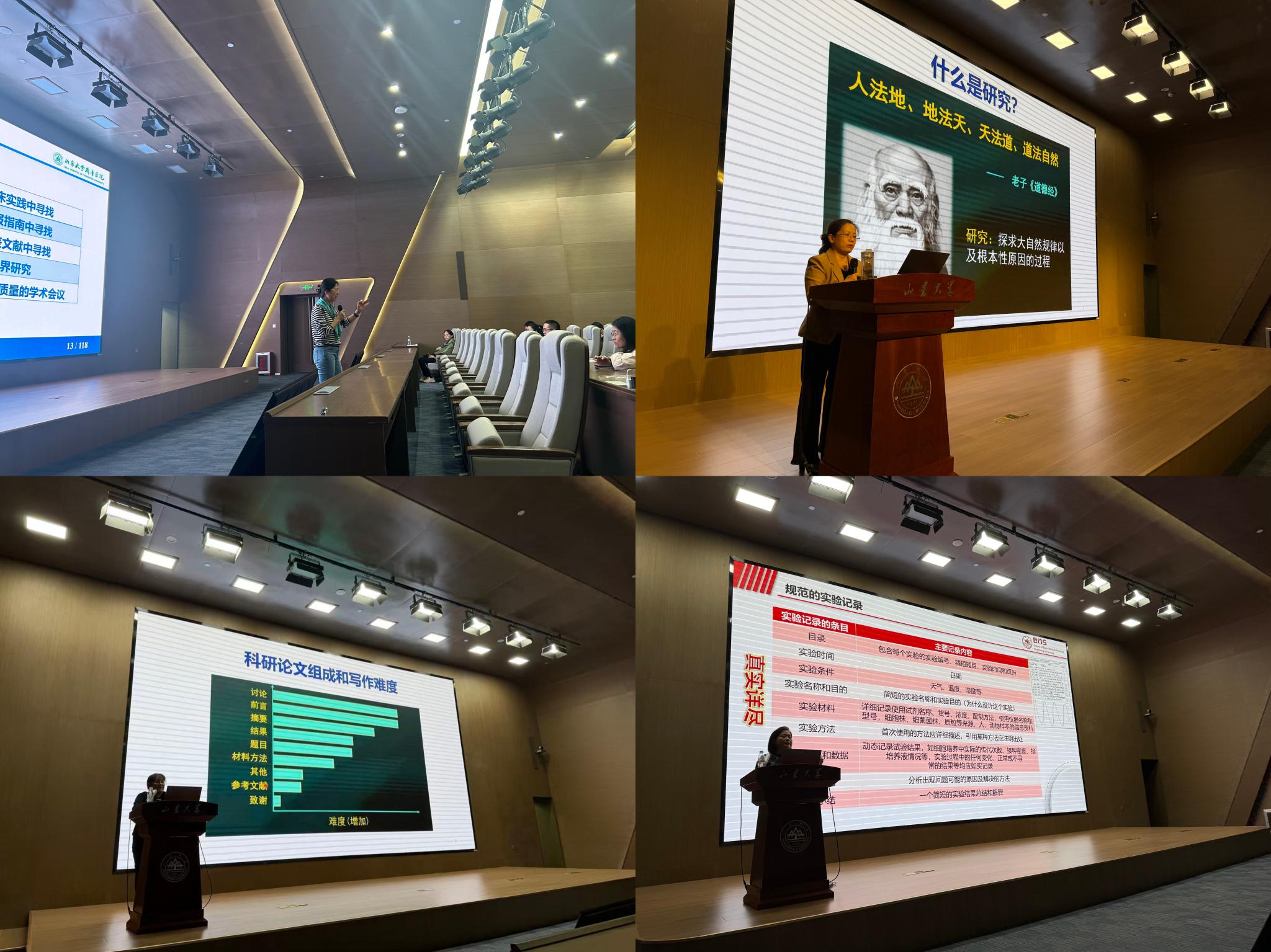 科研基本训练专题讲座活动中,中心特别邀请到来自山东大学齐鲁医院(第一临床学院)的博士生导师吕明教授,来自山东大学基础医学院的博士生导师梁晓红教授、高立芬教授、刘慧青教授为主讲教授。四位教授分别就医学科研选题、临床科研方法与设计、科研论文和学位论文撰写方法与规范、科研原始实验记录书写规范进行了系统、全面、细致的讲解,并在现场为学生们答疑解惑。