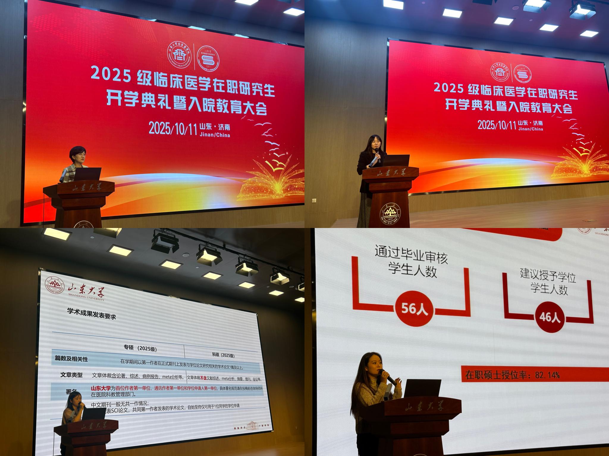 10月11日、10月12日,医学融合与实践中心(下简称“医融中心”)2025级在职研究生入学教育大会与科研基本训练专题讲座在趵突泉校区综合科研楼医道大学堂成功举办,大会及讲座在齐鲁医学院教学管理办公室指导下,由医融中心主办,来自医融中心与基础医学院的70余名2025级在职研究生线下参加。山东大学第二医院(第二临床学院)教学部主任林晓英出席并致辞,医融中心副主任、研究生办公室主任马兆垠主持。