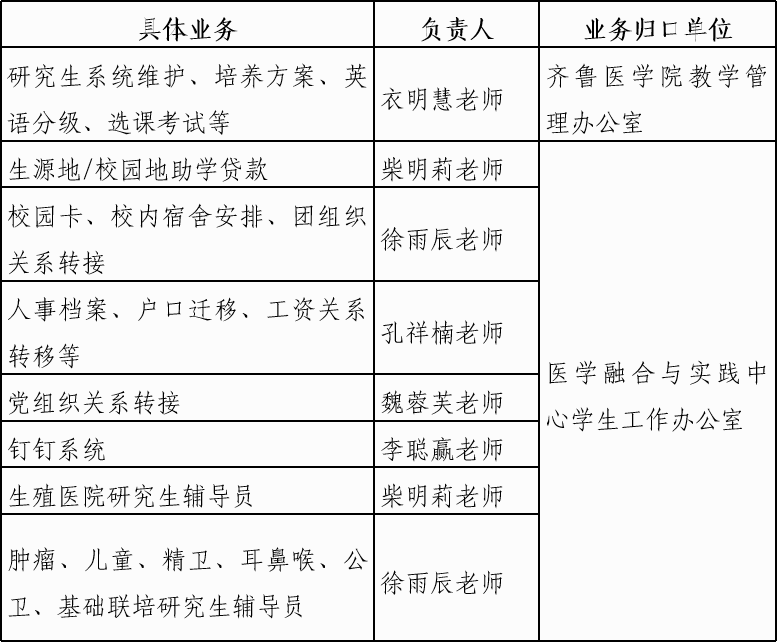 七、通知中未尽事宜,请钉钉咨询齐鲁医学院教学管理办公室及医学融合与实践中心学生工作办公室相关老师,具体如下表。