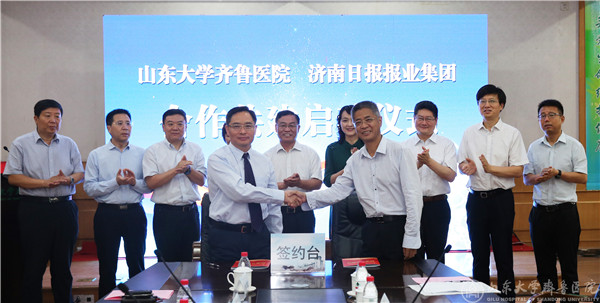 【本站讯】6月12日上午,山东大学齐鲁医院与济南日报报业集团合作共建启动仪式在新兴楼举行,山东大学齐鲁医学院党工委书记、医院党委书记侯俊平,济南日报报业集团董事长、党委书记、济南日报社社长马利出席会议并讲话,济南日报报业集团总编辑、副董事长、党委副书记张楠,集团副总编辑马凯,集团副总编辑樊祥钦,集团执行副总编辑赵治国,医院党委副书记苏华,党委副书记、纪委书记陈莹颖,总会计师刘庆,副院长田辉,院党委委员、副院级领导张万民等出席会议,党委副书记林亚杰主持会议。